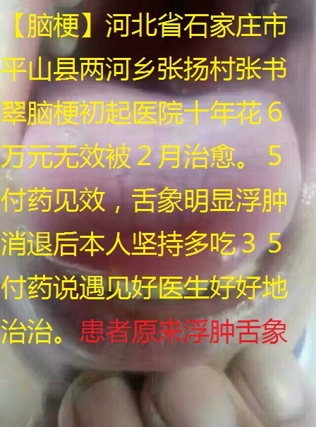 张书翠自称10年花费了6万元,越来越严重,不知道什么病,有名的村里药篓子。经李元明大夫治疗3付药微减轻,5付药明显减轻,患者大喜。22付药全身完全好转。李元明医生说:停药。患者见自己舌苔舌头大变样,惊讶地说“原来这才是正常舌头?”坚持多吃35付药说:摸见好医生了,好好地治治,怕以后犯病为难。