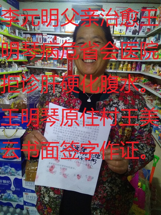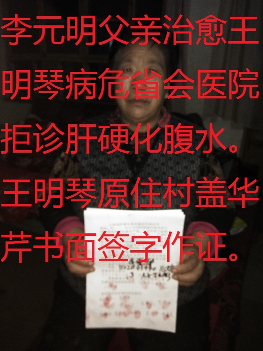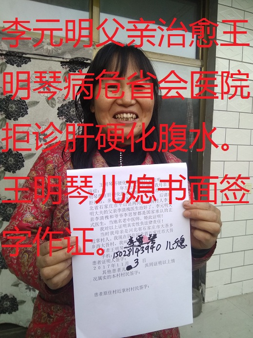 王明琴,女,当时28岁,当时住河北省石家庄市平山县大吾乡近掌村,当时丈夫任海山。当时还有肝硬化腹水,石家庄市和省会各大医院拒诊,病危。后来就诊李元明父亲李清槐大夫彻底治愈。现在健在,30多年没有复发。