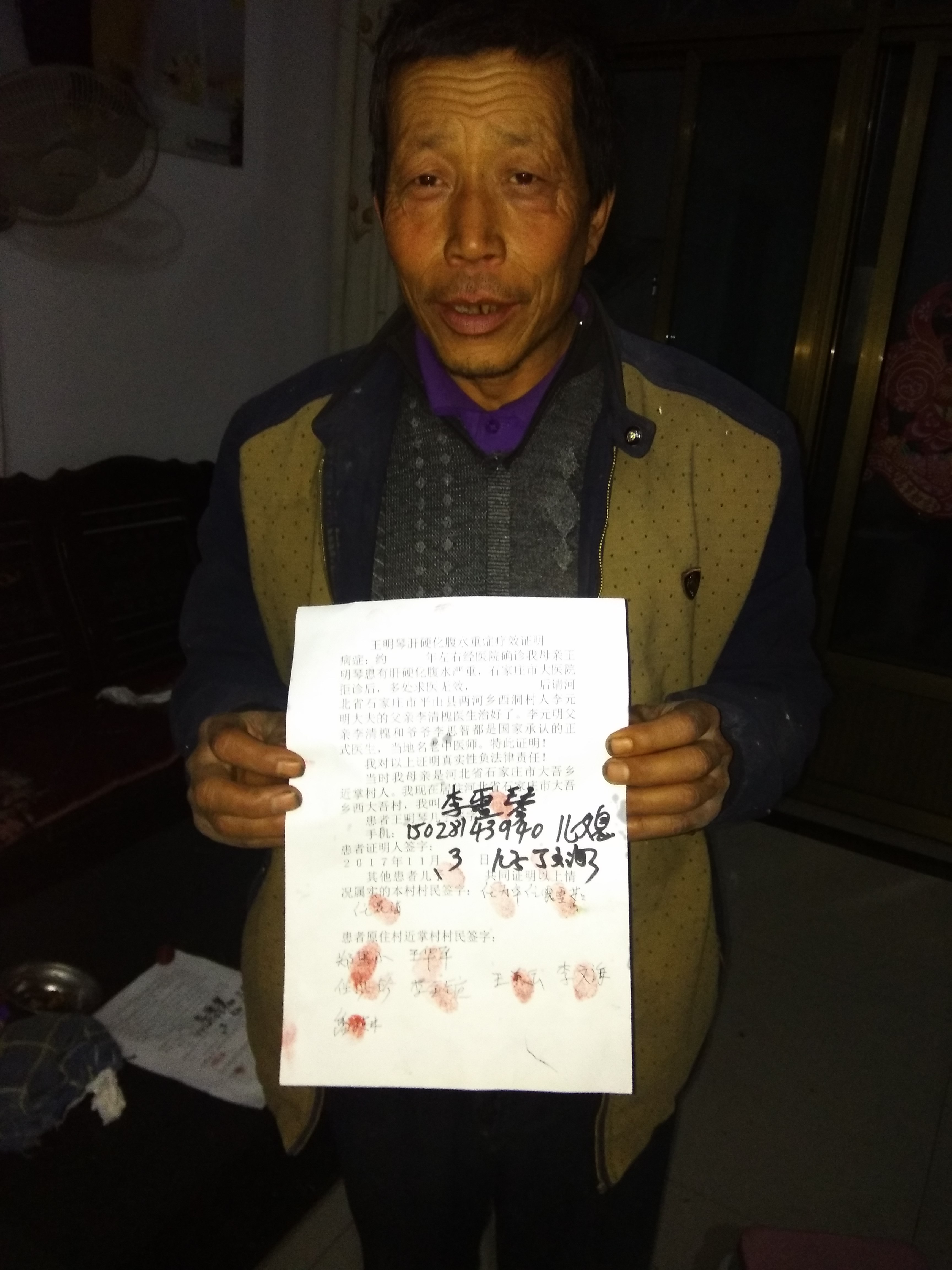 8、下图为肝硬化患者王明琴治愈后,当时居住的近掌村村民众人联名签字书面证明照片。