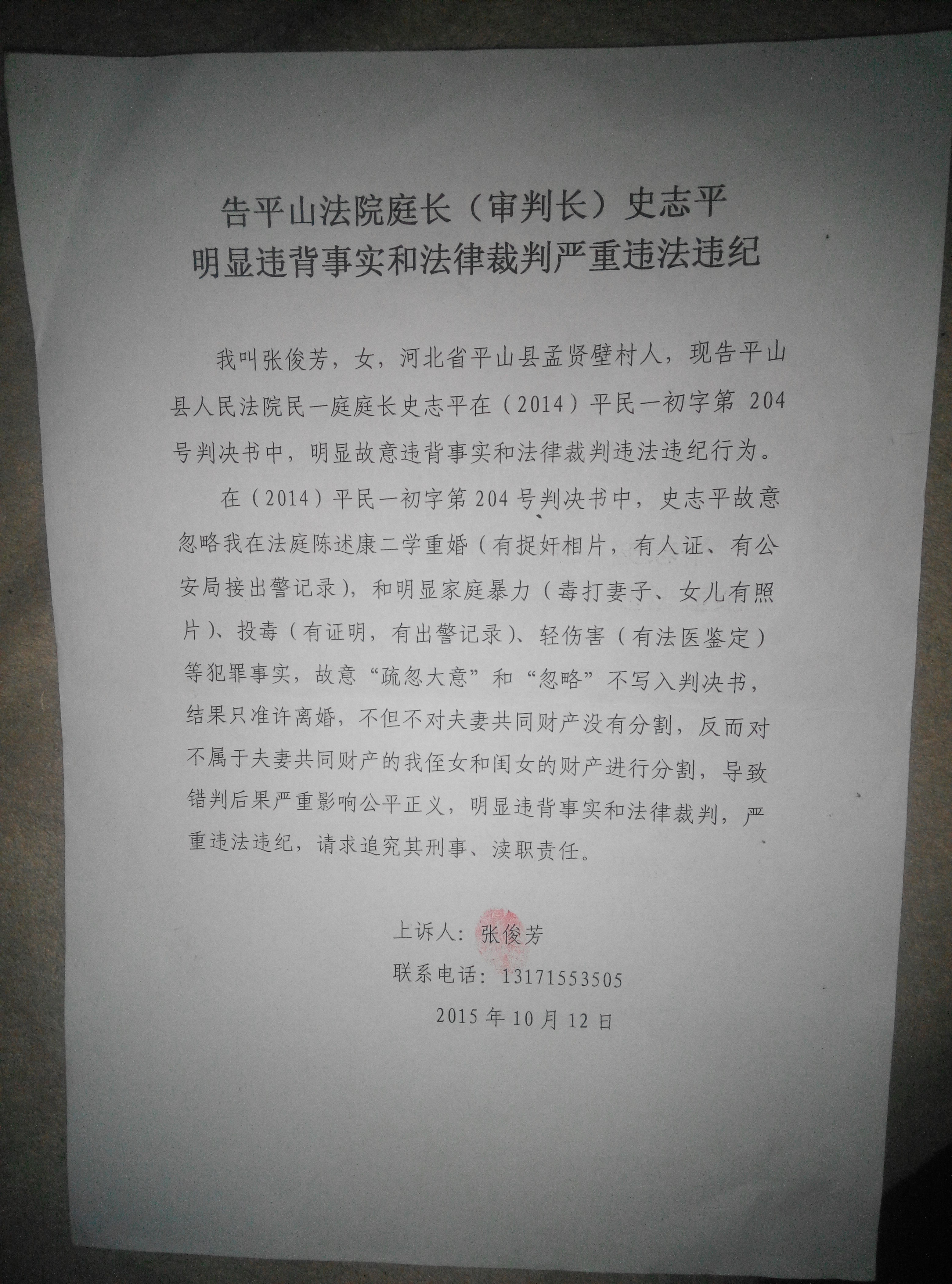 2015年10月18日本网收到石家庄市平山县平山镇孟贤壁村张俊芳控告材料(部分不规范,属本人撰写)。