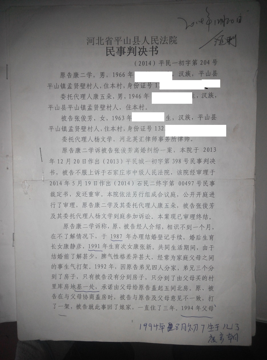 下图一审平山县人民法院史志平判决书最后页:张俊芳不能接受的是“在庭审笔录中说明不审理财产而判决书中有裁判财产内容”侵犯了张俊芳诉权。张俊芳反映我误导自己不对财产注意,没有努力诉讼,然后判决自己败诉,对法官史志平审判长十分不满,认为他是故意行为,滥用职权,收受贿赂后邪念驱使下的明显地违背事实和法律裁判罪行为,并向纪检委和检察院渎职犯罪、反贪污贿赂机关进行举报控告。