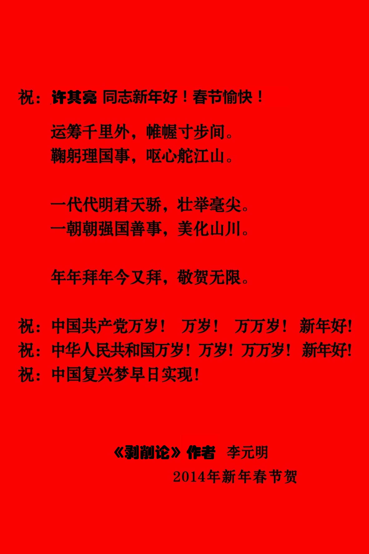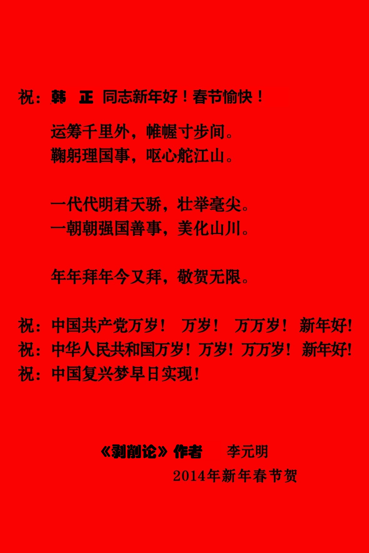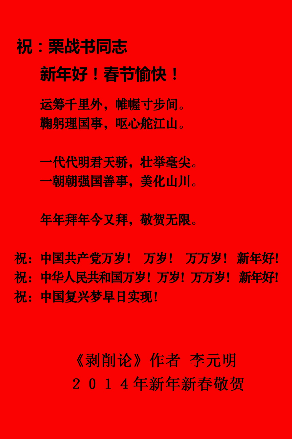 李元明2014年新年春节给中央领导寄去贺年卡,祝贺同志们新年好!春节愉快!贺年词如下: