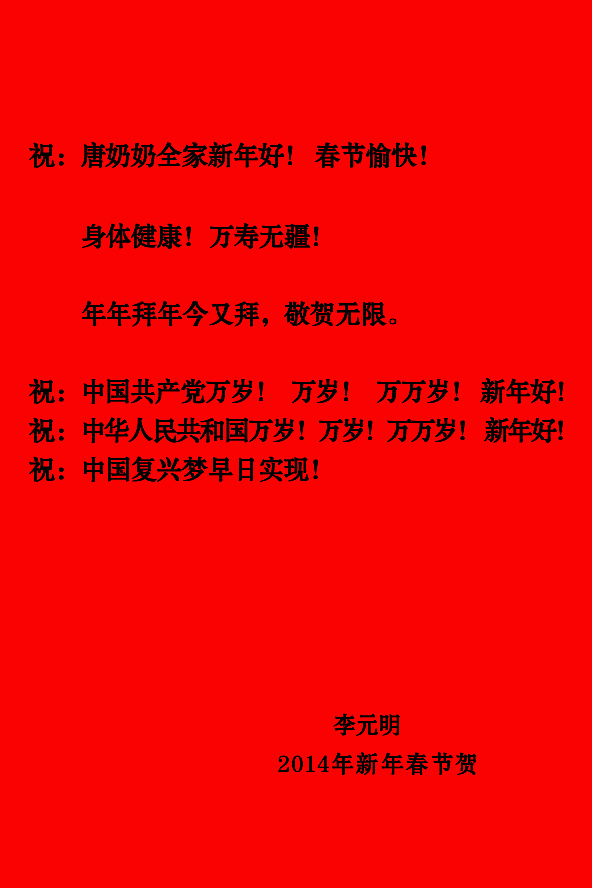 下面是2014年李元明向唐贤美奶奶拜年贺卡: