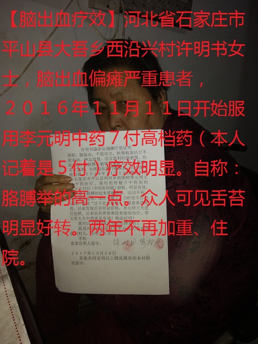 李元明7付药治疗许明书6年脑出血,严重偏瘫,不能自行站立行走。疗效:胳膊抬举高一点,舌苔明显好转,一年多没有患病住院。
