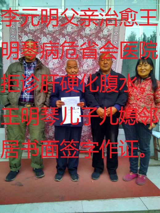 1、下图为肝硬化患者王明琴治愈后,儿子丁文海(最左)、儿媳李雪琴(最右)和儿子儿媳西大吾村邻居书面证明照片。