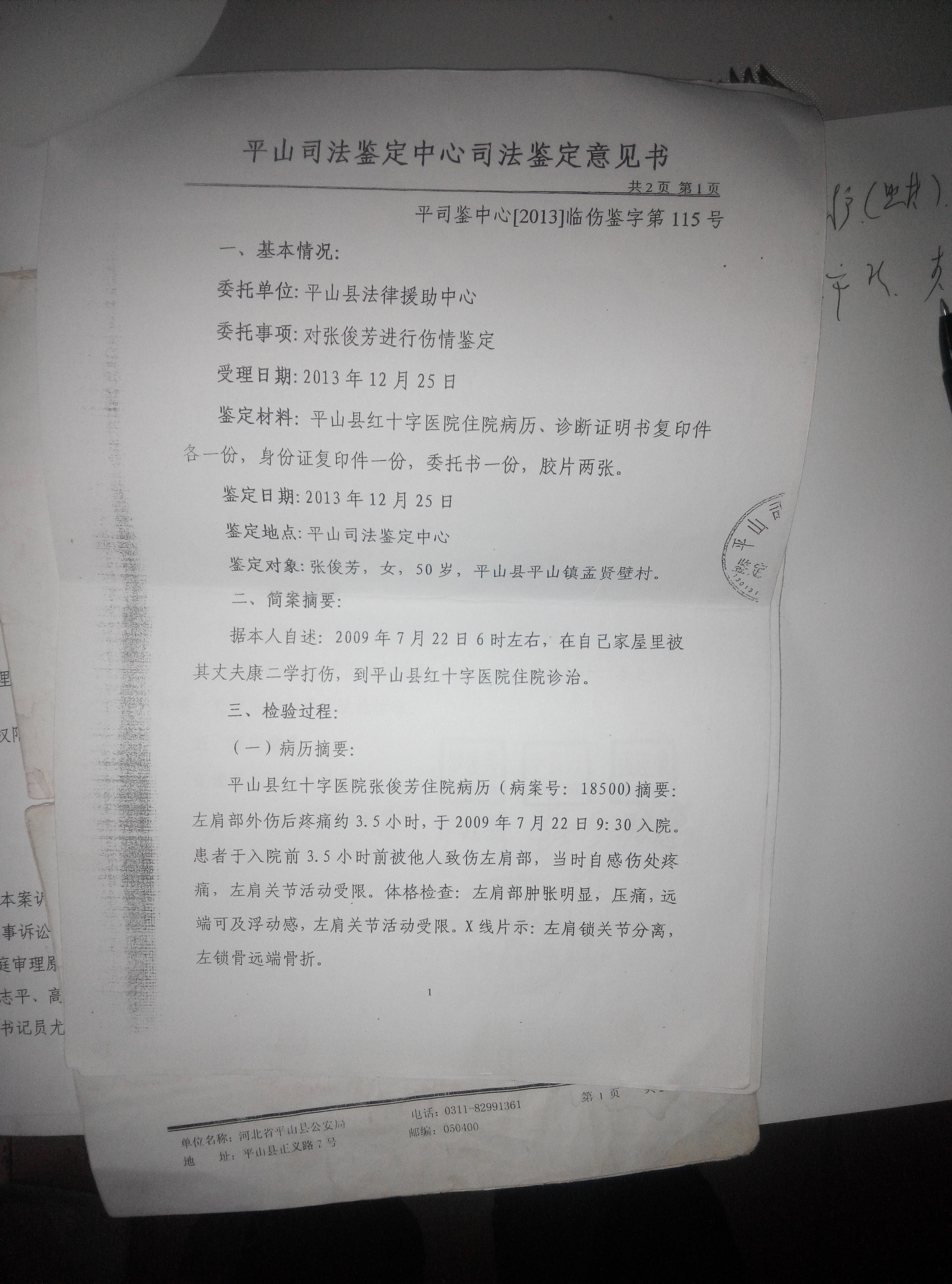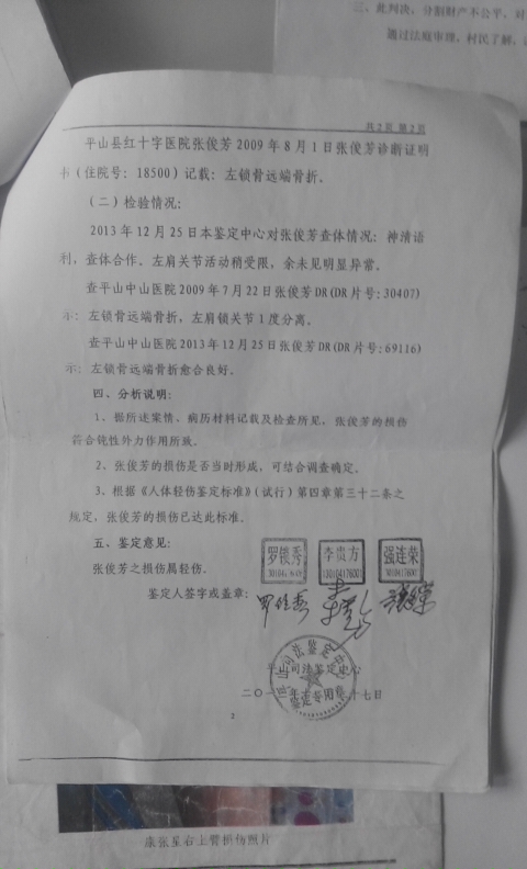 下图为张俊芳提供丈夫康二学殴打妻子张俊芳伤情鉴定结论为轻伤害: