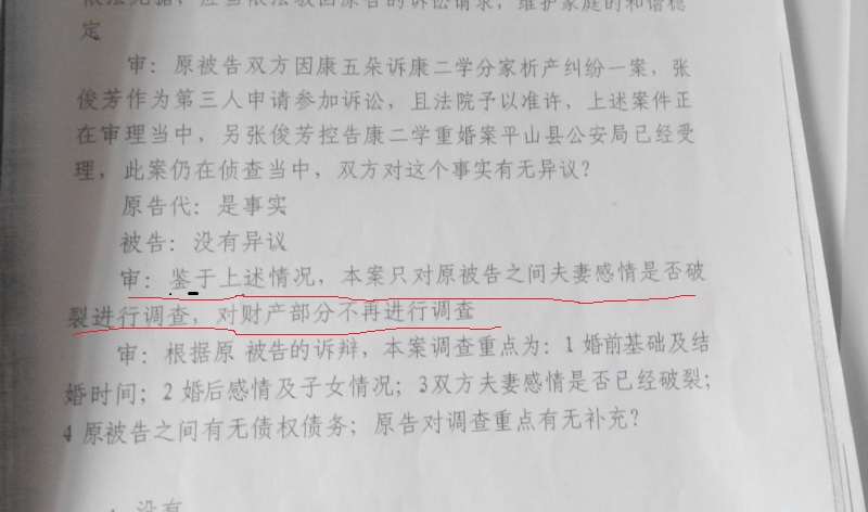 下图一二审庭审笔录为证“法院声称不审财产部分”。张俊芳反映:本来两个鸡棚的土地是当事人两口子的,而鸡棚是侄女、女儿筹资建设经营的,其鸡棚财产是第三人的,法院声称不审财产部分而判决财产部分,故意冤枉人。