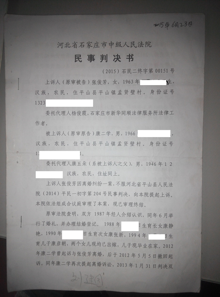 下图一审平山县人民法院史志平判决书最后页:张俊芳不能接受的是“在庭审笔录中说明不审理财产而判决书中有裁判财产内容”侵犯了张俊芳诉权。张俊芳反映我误导自己不对财产注意,没有努力诉讼,然后判决自己败诉,对法官史志平审判长十分不满,认为他是故意行为,滥用职权,收受贿赂后邪念驱使下的明显地违背事实和法律裁判罪行为,并向纪检委和检察院渎职犯罪、反贪污贿赂机关进行举报控告。