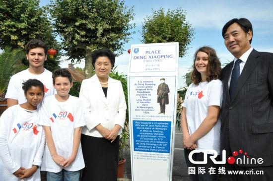国务院副总理刘延东、中国驻法国大使翟隽与蒙达尔纪的青少年在“邓小平广场”揭幕牌前合影