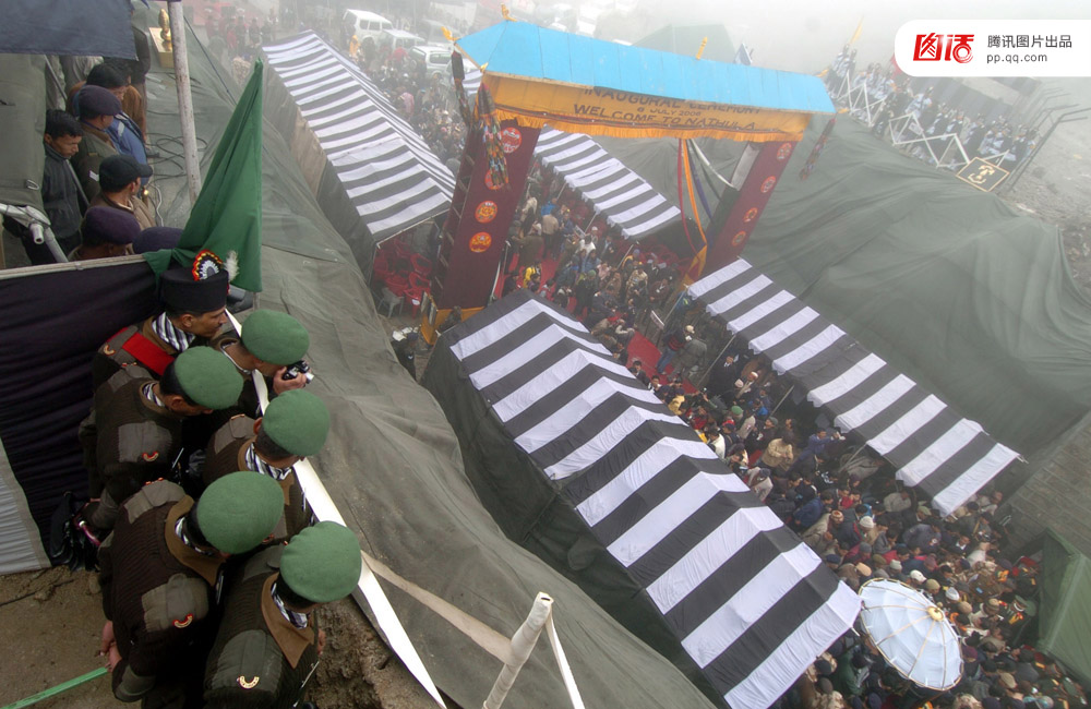自1962年中印边境冲突后,两国相继撤销原边贸市场的海关等机构,边贸通道被铁丝网隔离。2006年,中印乃堆拉山口边贸通道在关闭44年后重新开通。图为2006年7月6日,在中印边境乃堆拉山口,印度边防军人从锡金一侧观看重开乃堆拉边境贸易通道仪式。