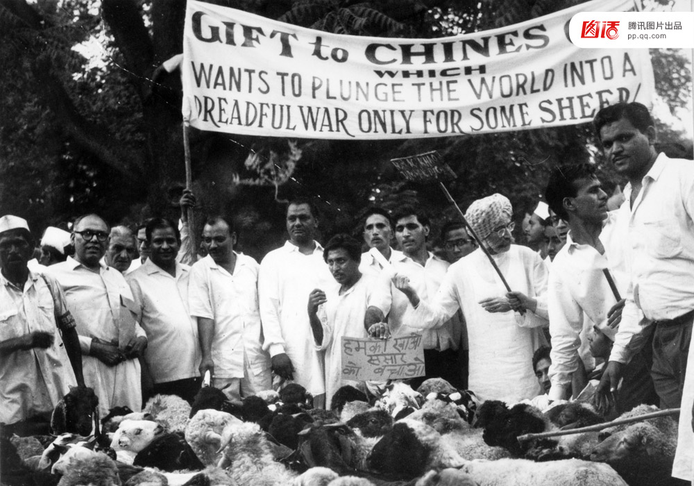 1965年印巴战争时期,中国介入,并向印度提出强烈抗议,指责其“违反停火协议修建大批工事”,“掠夺中国牧民的羊群。”图为1965年,印度首都新德里中国大使馆门口,印度人赶着羊群,打出抗议的横幅:“送给中国的礼物。中国人就愿意为了几只羊掀起战争。”第二次中印战争差点爆发。