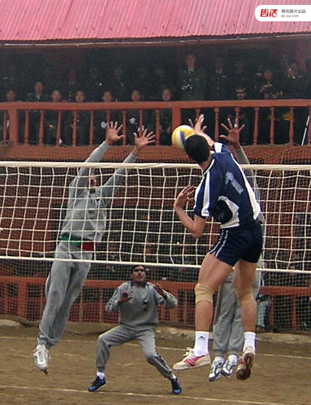 图为2006年,在中印边界附近的一个小镇,中国军人观看印度军人打排球。