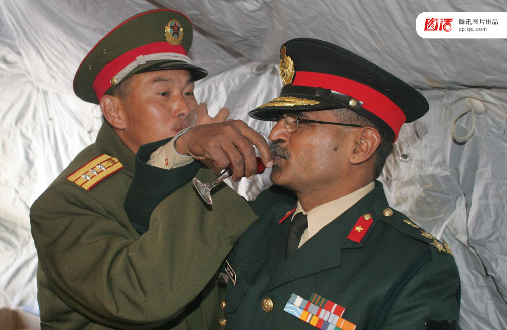 图为2006年,在中印边界附近的一个小镇,中印军官喝交杯酒。