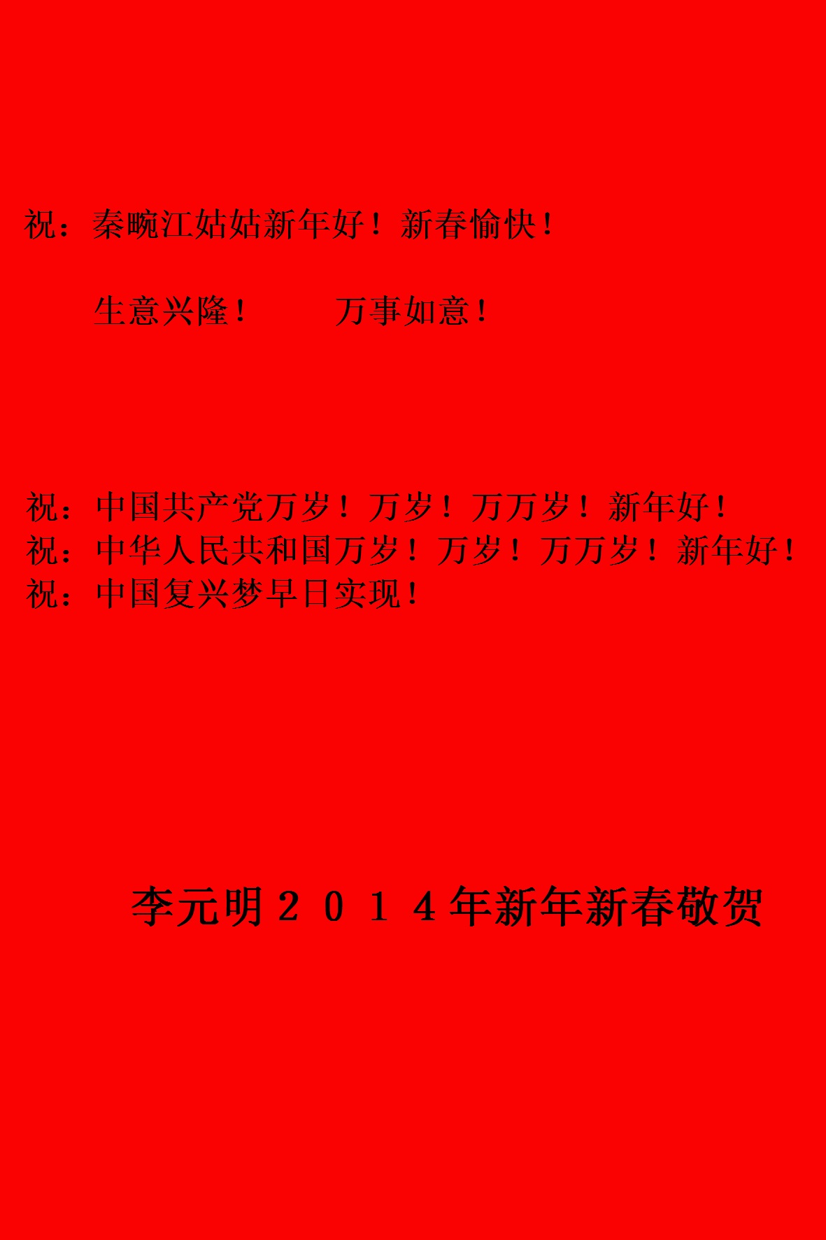下面是2014年李元明向秦卫江姑姑拜年贺卡(给秦卫江大叔和秦天二叔的贺卡按工作关系另行制作):