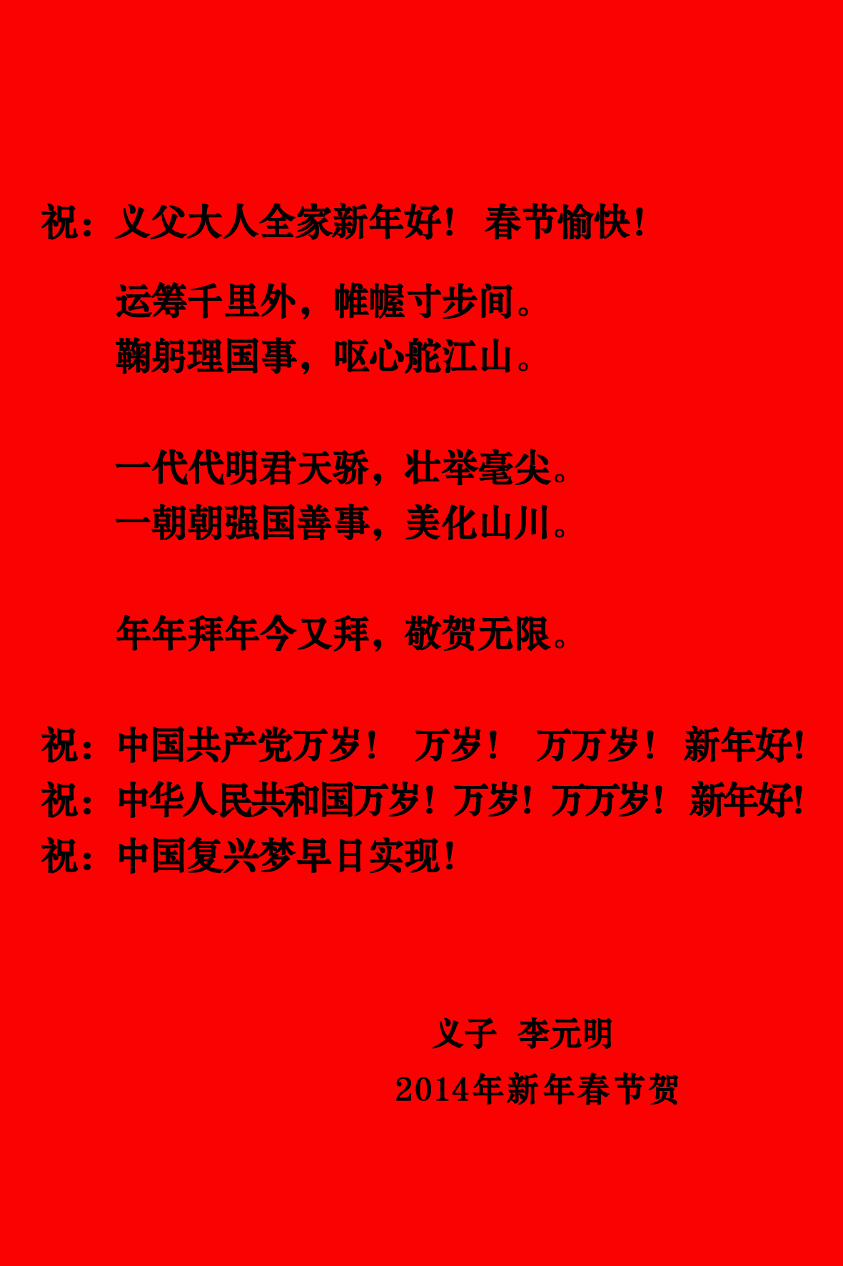 下面是2014年李元明向义父邓朴方拜年贺卡: